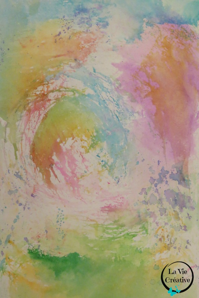 La deuxième technique sert à faire des fonds variés. En fait, on n’a que peu de contrôle sur le résultat final, c’est ce qui rends la technique vraiment amusante (sauf si vous êtes très perfectionniste).