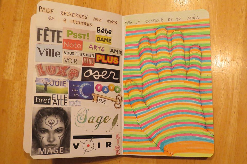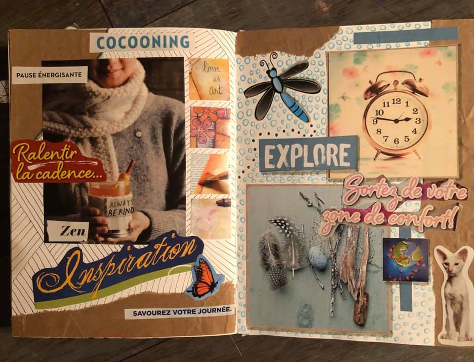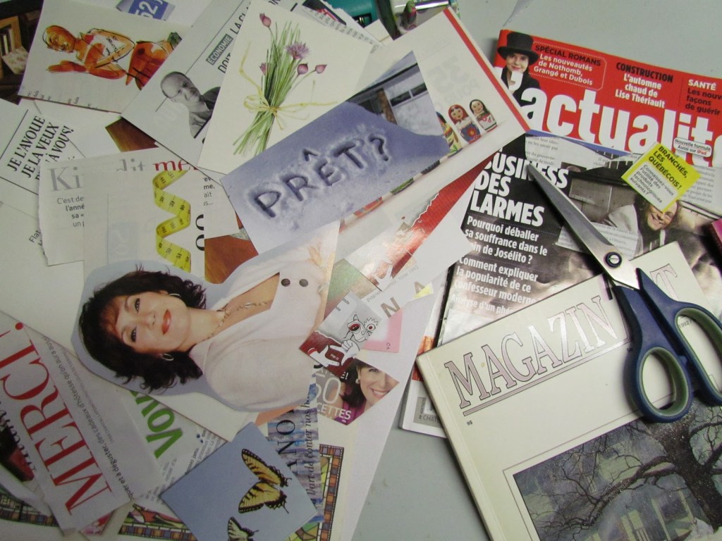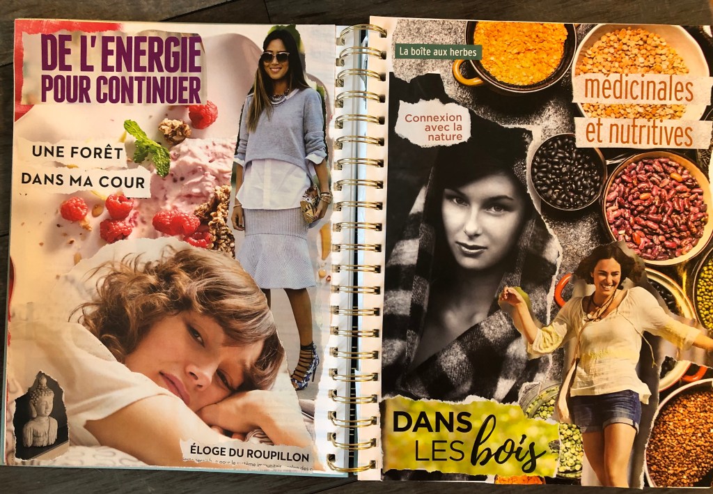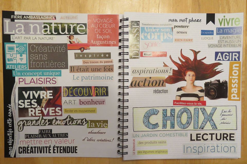 Il existe toutes sortes de collage: intuitif, ludique, avec une seule couleur, composé uniquement de mots ou uniquement d’images, créé tout simplement à partir de mots, d’images, de couleurs qui nous font vibrer. Dernièrement, j’ai créé mon tout premier collage sur une colère que je ressentais. On peut aussi créer un collage sur des objectifs, sur un mot phare, une intention, un rêve, sur ce qu’on veut voir arriver dans sa vie. Les possibilités sont infinies… et les bienfaits aussi.