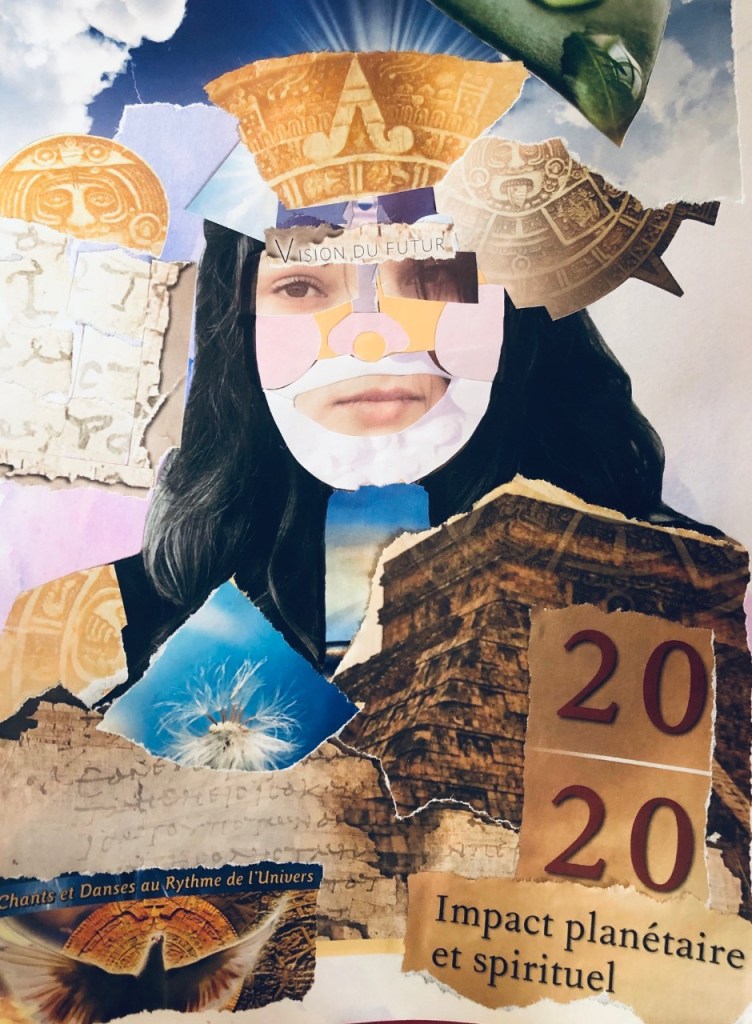 Finalement j’ai fait un collage fou. Je m’étais donné la consigne de n’utiliser qu’un seul magazine (déjà assez entamé) et de créer quelque chose de laid. Bon, je ne trouve pas ça nécessairement laid, mais de partir avec cette idée, c’est fou comme ça enlève la pression de faire du beau. Ça me garde dans le plaisir et non dans la performance. Parfois le résultat est surprenant. Y’a plein d’histoires qui veulent sortir de cette création.