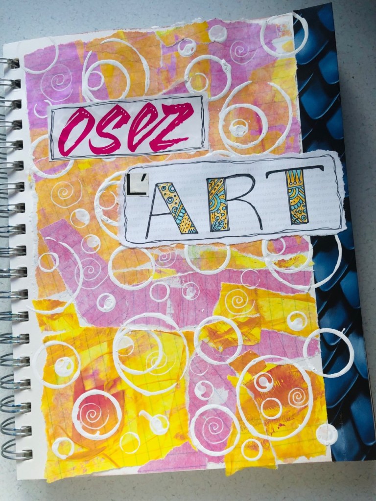 J’ai de la difficulté à garder des traces de ce que je fais parce que j’utilise tellement de supports différents. Parfois, je travaille sur une toile, une grande ou une petite. Parfois c’est dans mon cahier mixed-media ou dans mon carnet d’aquarelle que je crée. Parfois j’utilise un grand cahier, un petit ou celui du Dollarama. Je crée aussi dans mon bujo, mon journal créatif, mon scrap journal ou sur une feuille libre. J’y vais selon ce qui me fait envie et qui est le plus approprié au projet que je désire réaliser.