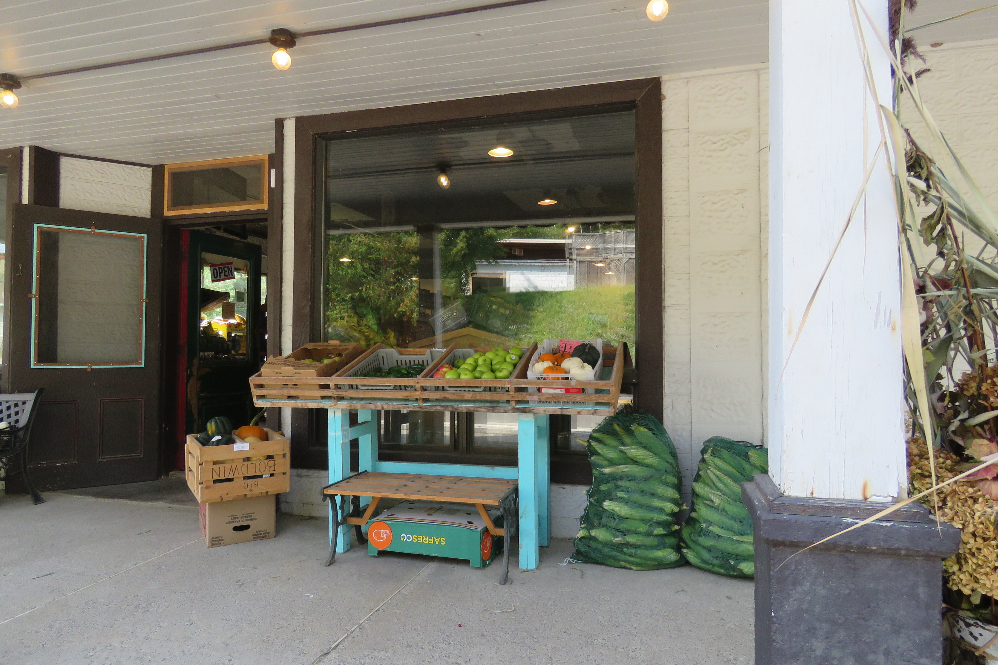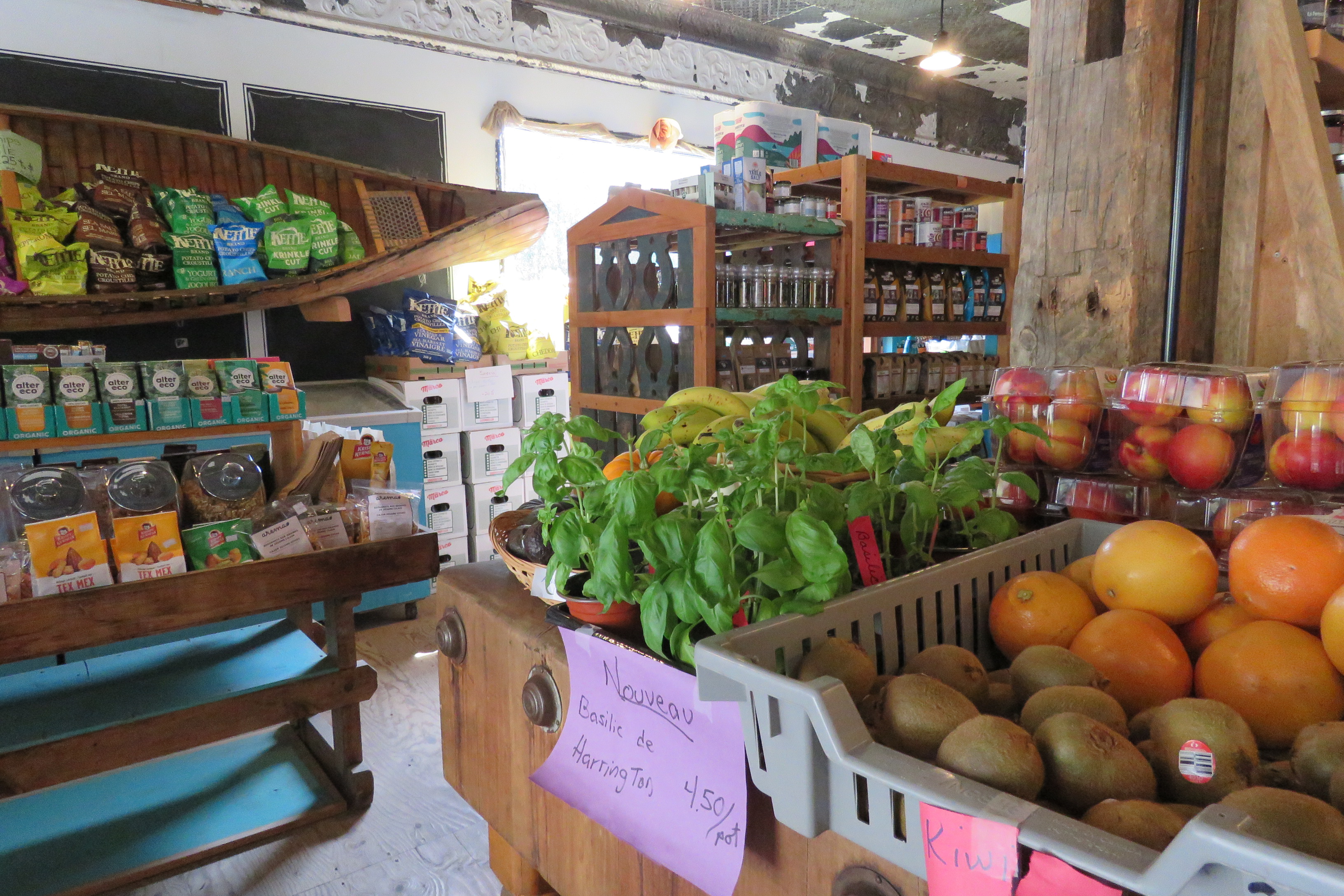 On arrive au Marché Lost River. Situé dans l’ancien magasin général du village, le marché offre des fruits et légumes frais et toute une gamme de magnifiques produits du terroir. Je reconnais les produits des producteurs locaux, de cueilleurs des bois aussi.