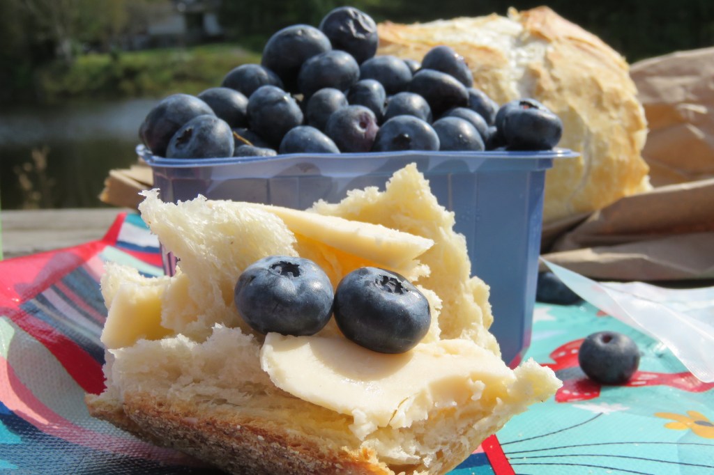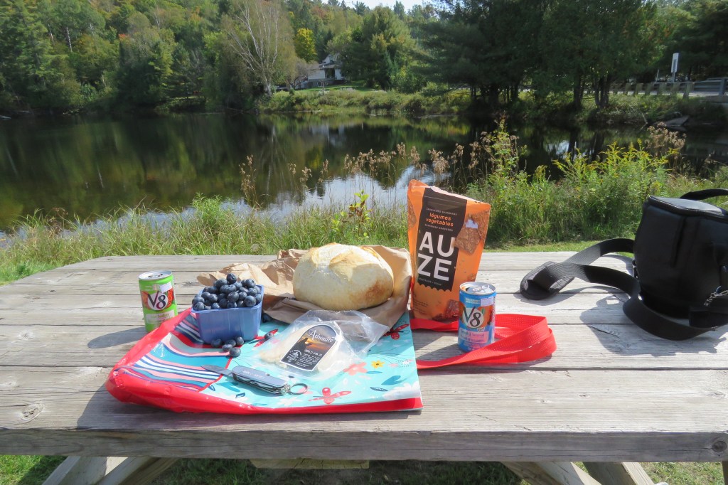 Cette courte randonnée nous avait tout de même creusé l’appétit. On a improvisé un pique-nique sur le bord d’un lac avec les beaux produits achetés au Marché.
