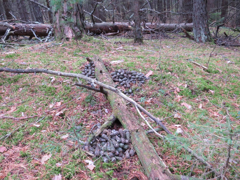 Je me baladais doucement dans cette belle forêt, admirant les majestueux pins sylvestres quand j’ai remarqué ces étranges amas de cônes. J’étais surprise. Je me suis approchée pour les photographier.