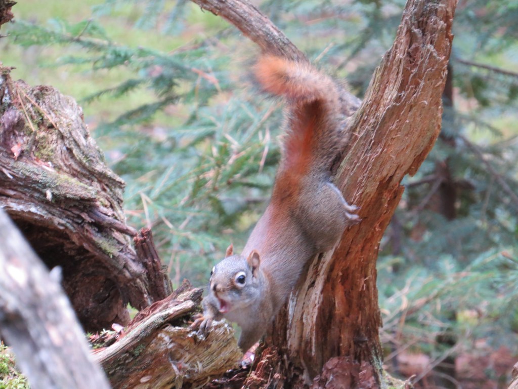 J’ai soudainement entendu un cri d’alerte. «Au voleur! Au voleur!» criait un tout petit écureuil roux en sautant frénétiquement de branche en branche, en dévalant à toute vitesse les troncs… jusqu’à moi.